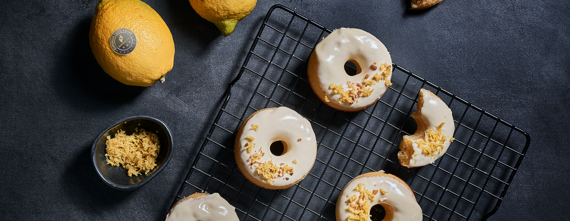- Sumergir la parte superior de cada donut en el chocolate y echar por encima un poco de ralladura de limón.
